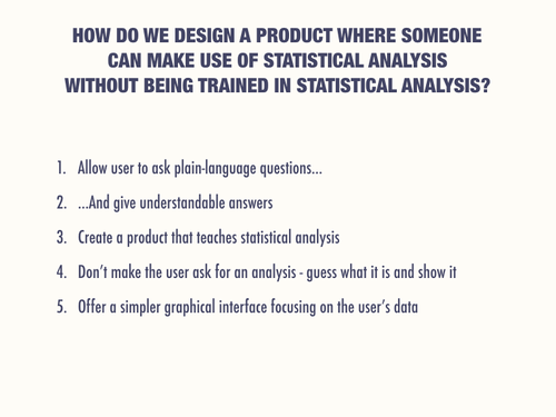 Existing statistical products are very complicated - focused more on test names than on utility, there is a gulf between people who understand statistical analysis and those who don't. This is why we created Analytic Catalyst at IBM SPSS. I was the primary UX/UI designer, and my goal was to design a product where business users can make use of statistical analysis without being trained in it.